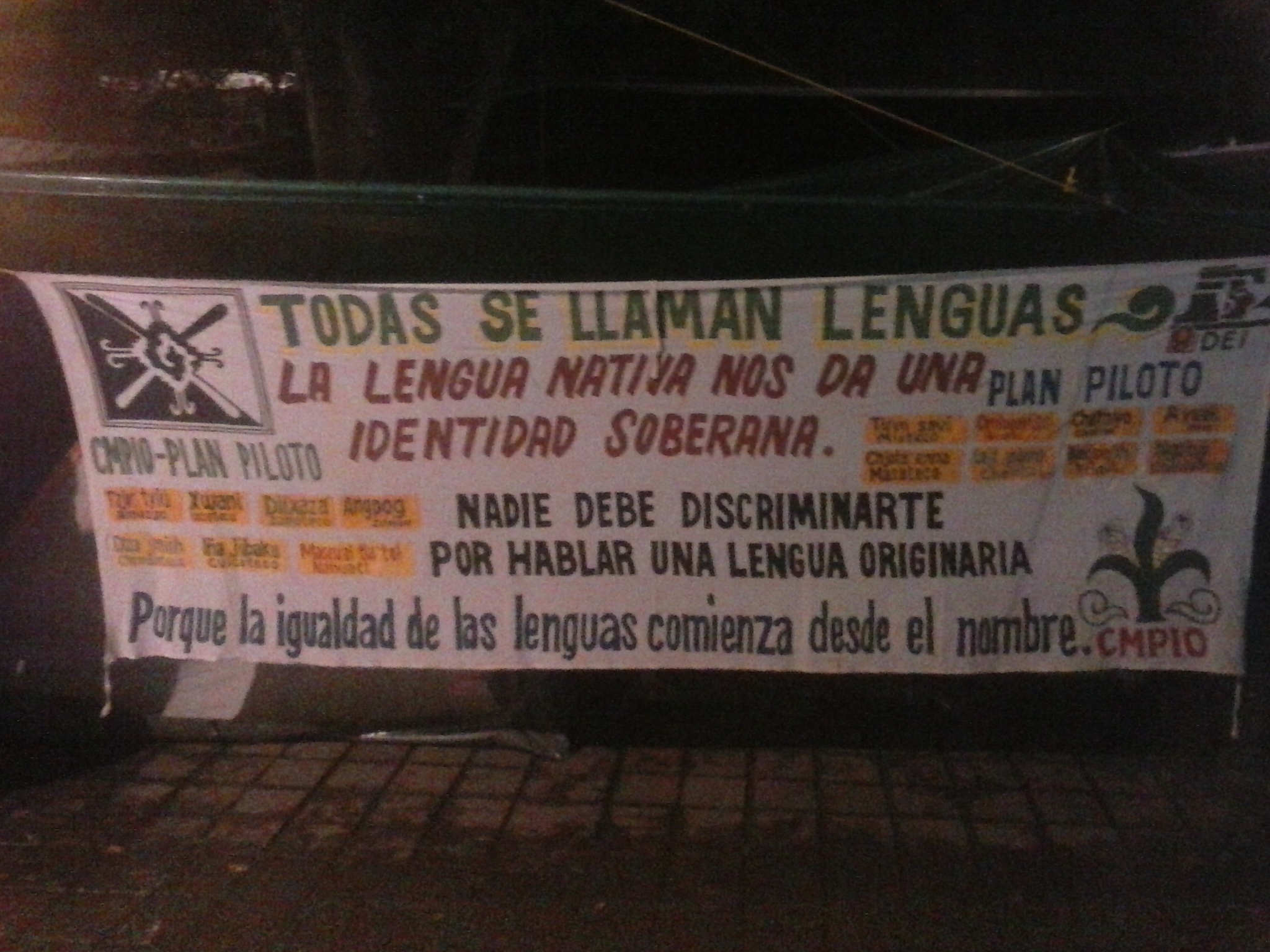 Todas se llaman lenguas (All languages are named) www.todas-lenguas.mx (Many languages and dialects are spoken in the southern states of Mexico, watch the video below to hear the differences between some of them)La lengua nativa nos da una identidad soberana (The native language gives us a sovereign identity) Nadie debe discriminarte por hablar una lengua originaria (Nobody should discriminate against you for speaking a native language) Porque la igualdad de las lenguas comienza desde el nombre (Because equality of languages starts from the name)