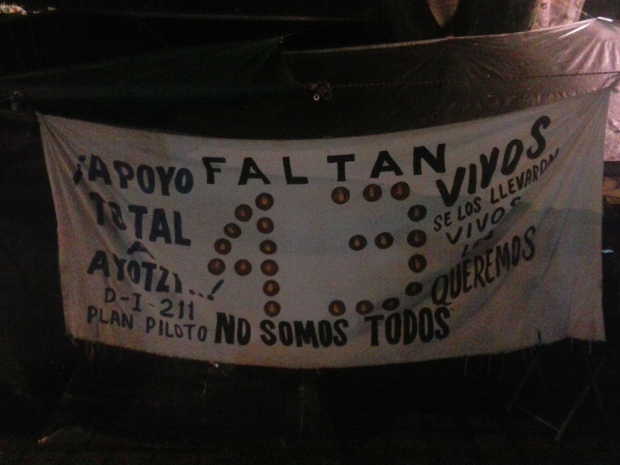 Faltan 43 no somos todos (We are not all missing 43) 43 Students are missing a protest on September 26, 2014. Read more on the 2014 Iguala mass kidnapping wikipedia page. Vivos se los llevaron vivos los queremos (They were taken alive, we want them alive) Apoyo total a Ayotzi (Full support for Ayotzi [the city of the college that the students attended])
