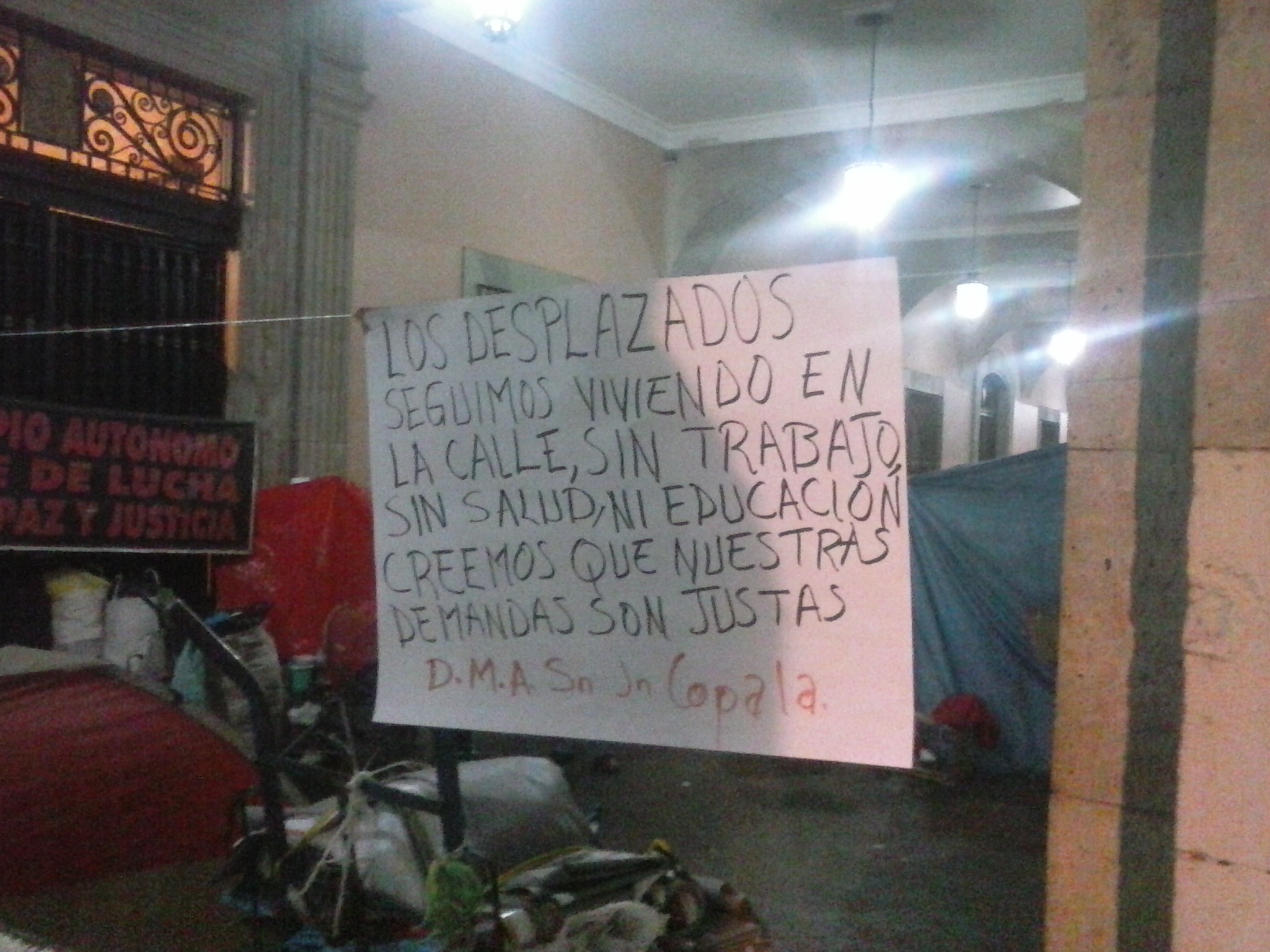 Los desplazados seguimos viviendo en la calle, sin trabajo, sin salud, ni educación. Creemos que nuestras demandas son justas. (The displaced are still living on the street, no job, no health, no education. We believe that our demands are fair.)